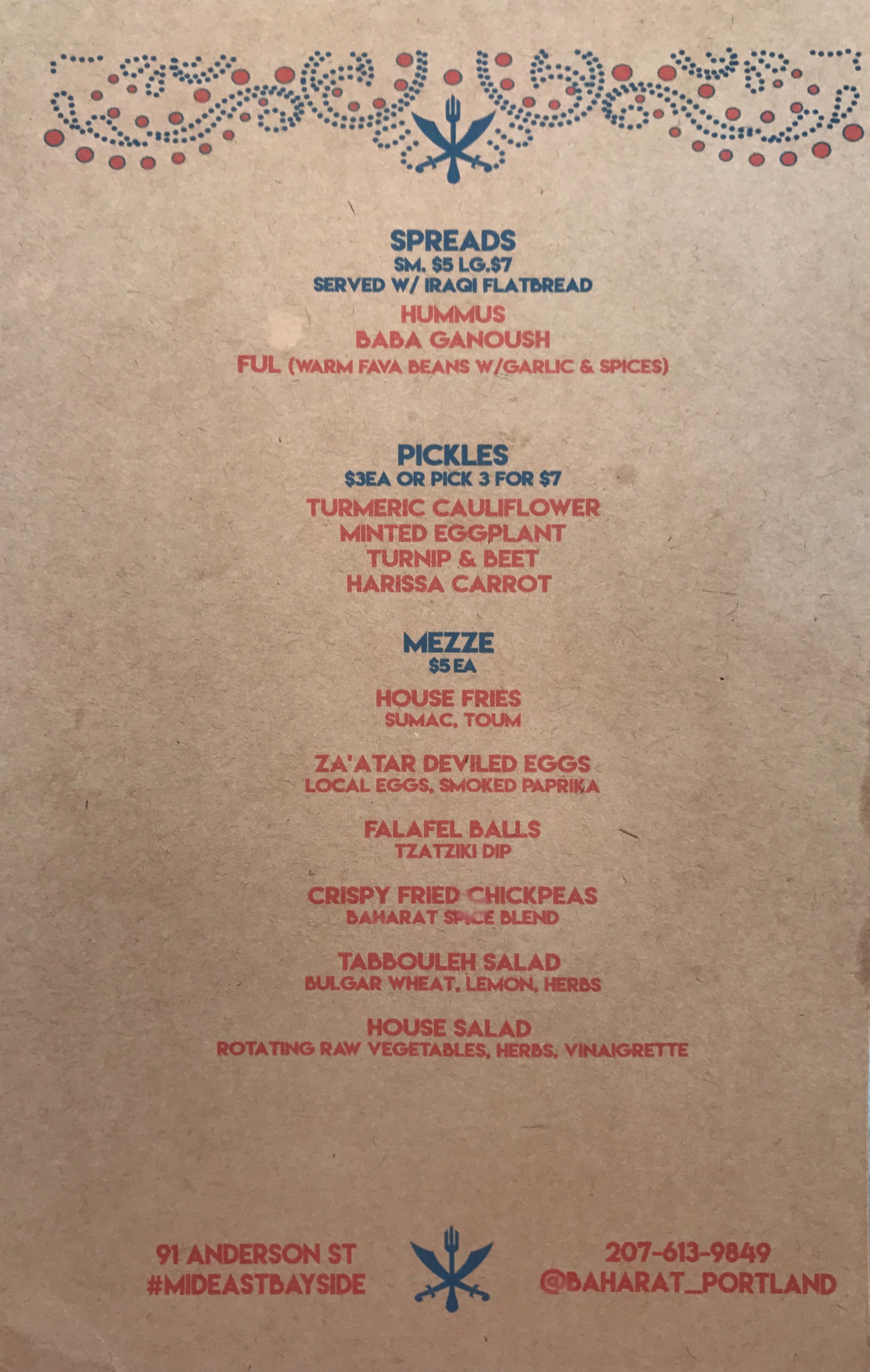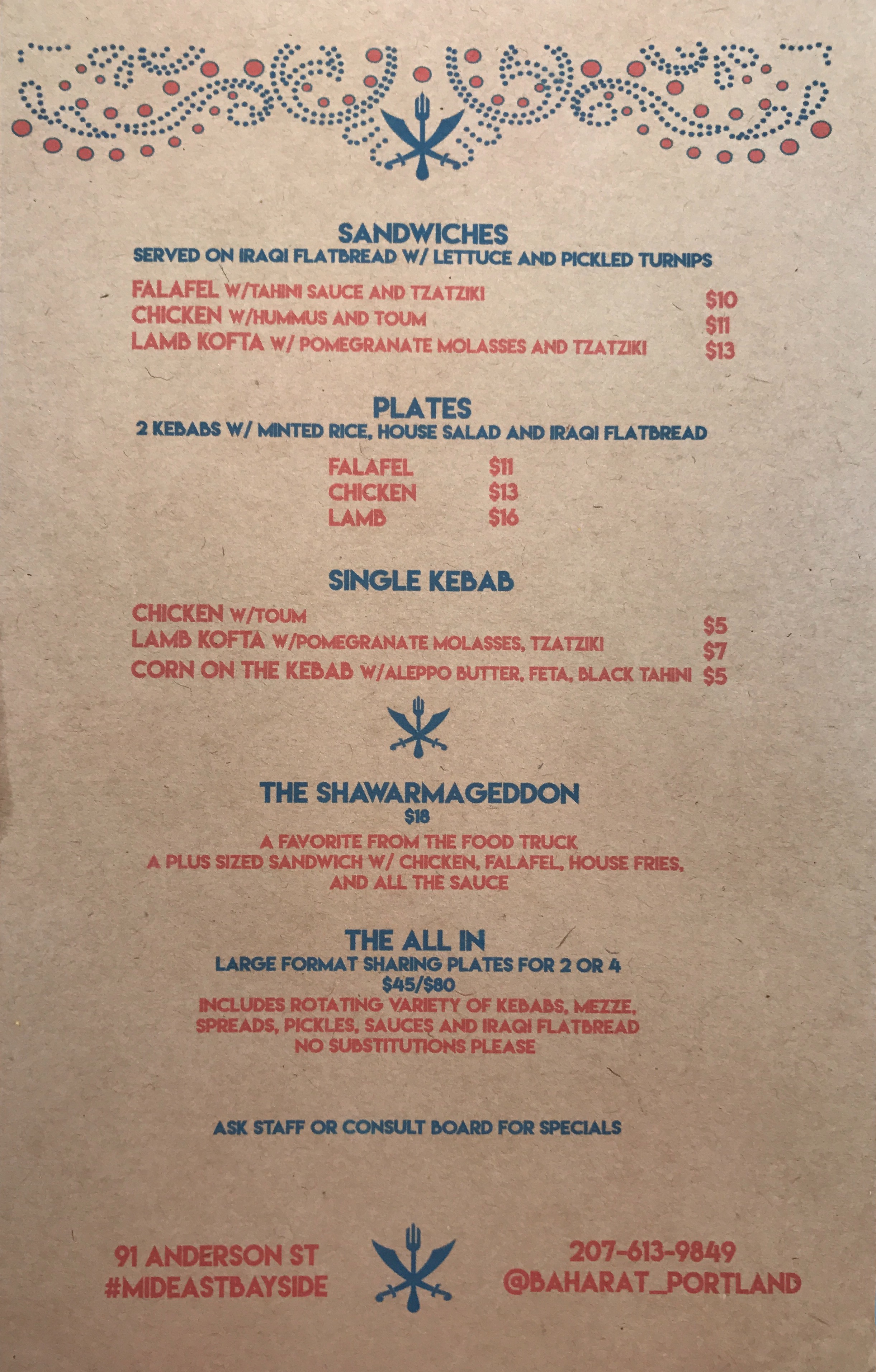 Baharat was opened in early 2017 by the great folks who formerly ran the Shawarma food truck, a favorite of locals & visitors alike. Though I was sad to see the truck go away, this new menu has me saying “what truck”?!